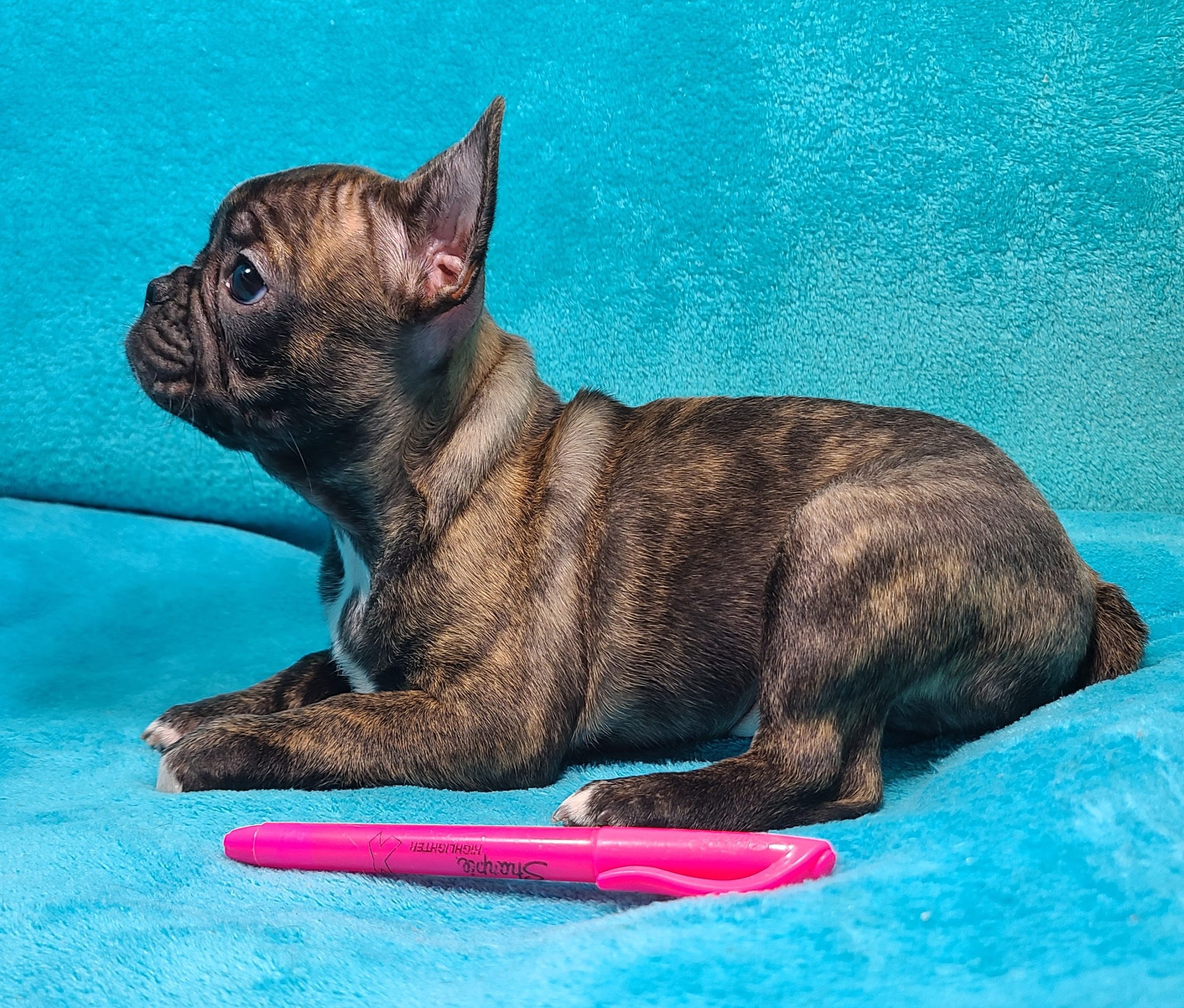 Beautifully Brindle Baby Mira is a gorgeous little Frenchton princess with a wonderful personality.