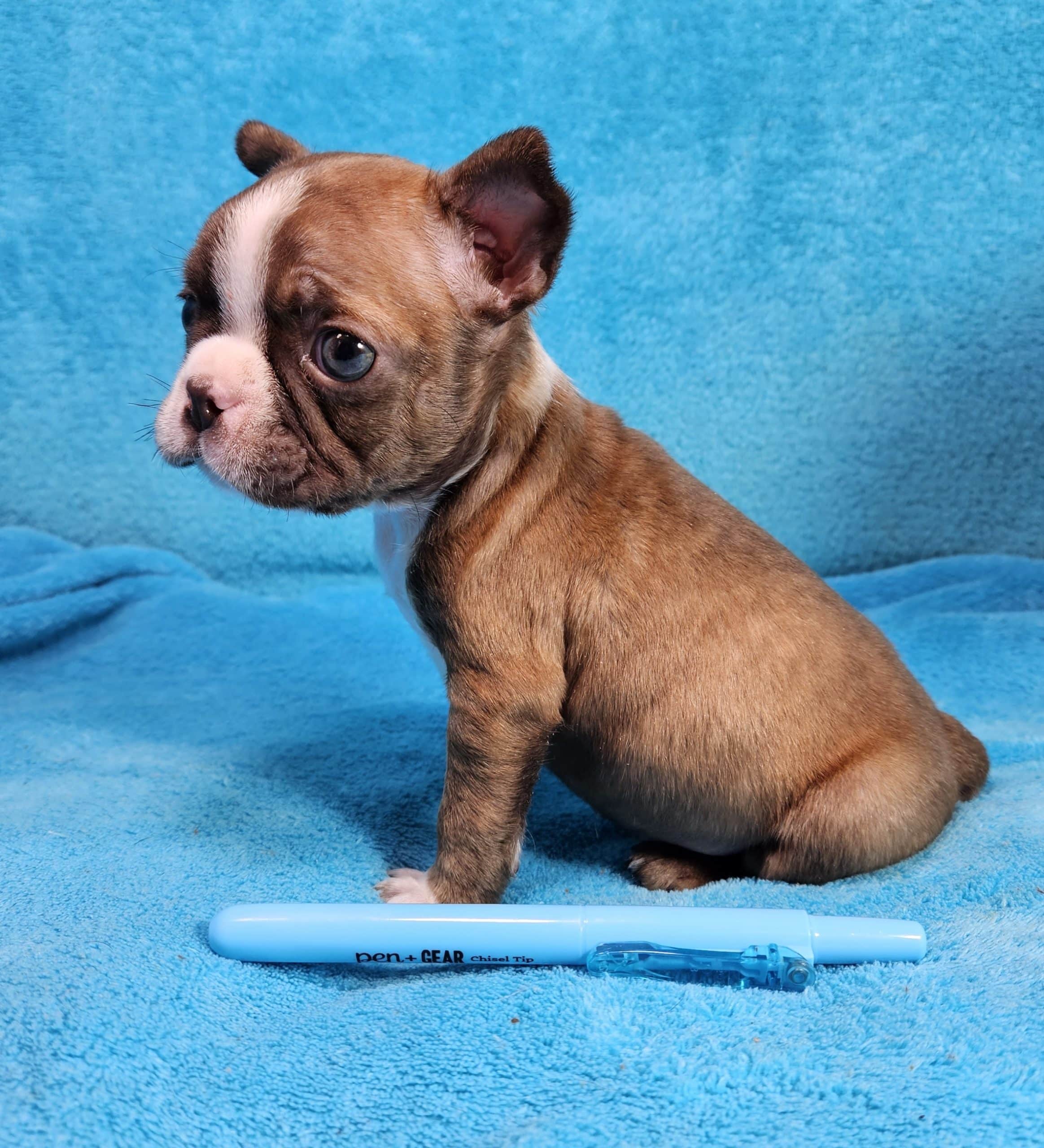 Handsome Prince Mixer is a gorgeous guy with a stunning outfit! He dons a strikingly unusual coat with a beautiful brindled fawn coloring and a chocolate nose. The brindled fawn is a pattern of lighter and darker fawn – very eye-catching! His coat is accented by a thin white blaze, darker mask, white chest and a white goatee. Mixer is the largest of his litter and is built pretty close to a 50/50 Frenchton build but with a leaning more to the stubbier side due to his somewhat shorter legs. He’s got these gorgeous ears that he will grow into and a great snout (with some good length to it to add healthy longevity potential). His eyes now are a beautiful blue-green and since he’s our first baby with this coat coloring, we will have to wait and see what his eye color will look like as he matures. I can’t wait to see Mixer all grown and bulked up. He’s going to have movie star looks!